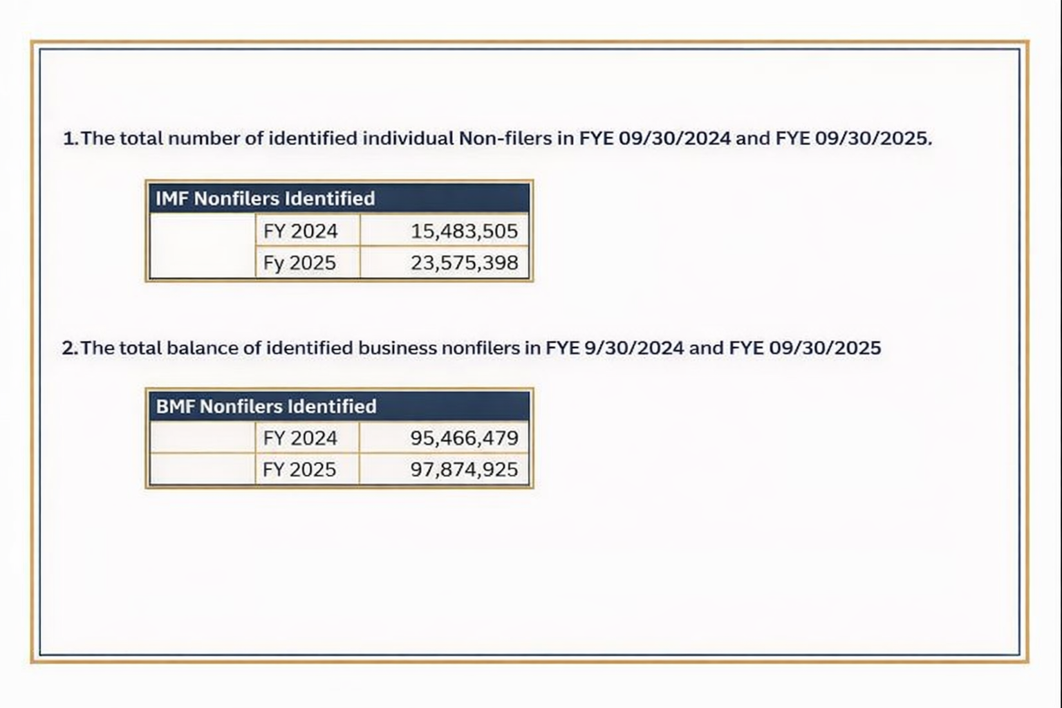 Identified non-filers for fiscal years ending 09/30/2024 and 09/30/2025. IMF refers to individual taxpayer accounts; BMF refers to business taxpayer accounts.
